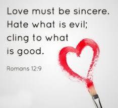 Romans 12:9Love must be sincere. Hate what is evil; cling to what is good. 10Be devoted to one another in love. Honor one another above yourselves. 11Never be lacking in zeal, but keep your spiritual fervor, serving the Lord. 12Be joyful in hope, patient in affliction, faithful in prayer. 13Share with the Lord’s people who are in need. Practice hospitality.